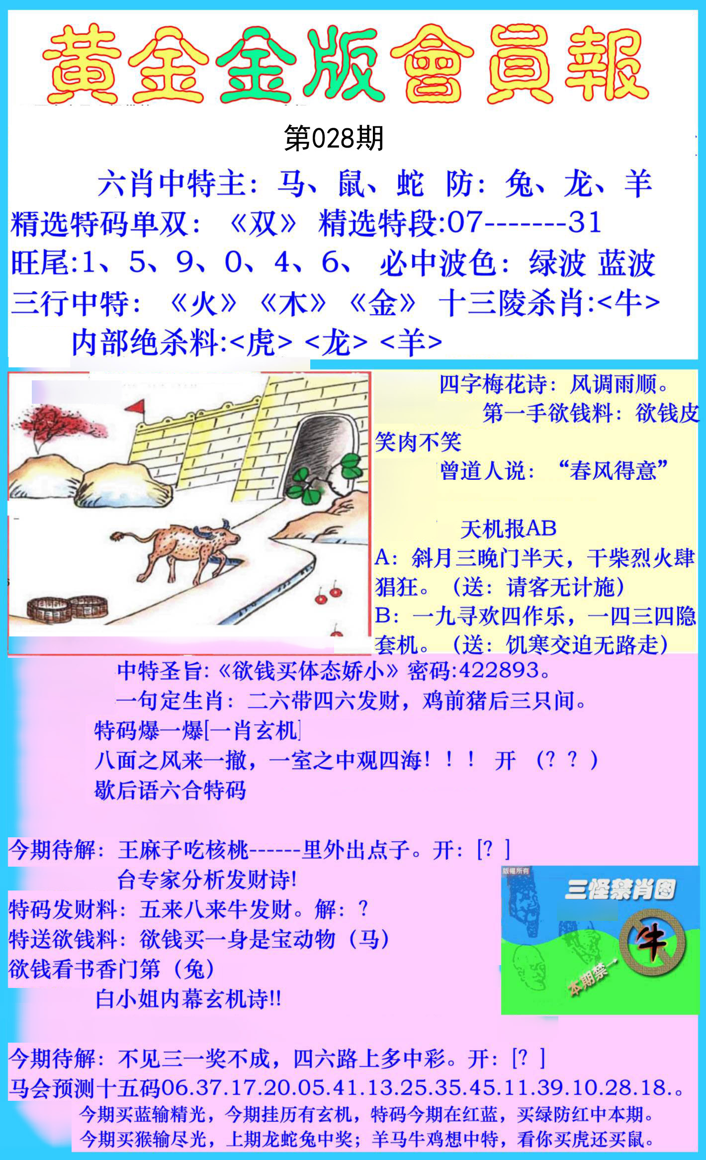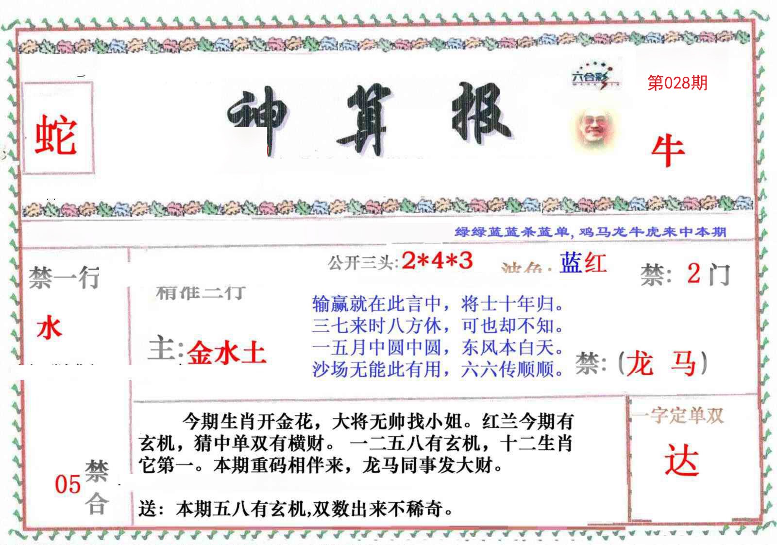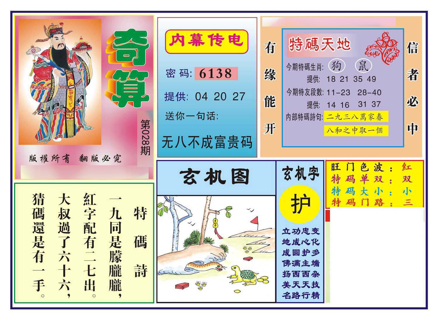 | 028期:【单数+蛇鼠兔鸡】开:?00准 |